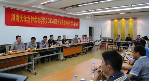 2013年7月12日至14日av影片 2003届硕士研究生毕业十周返校活动在av影片 举行。在返校活动期间,学院书记张展羽教授、院长顾冲时教授、副院长陈菁教授和副院长肖洋教授参加了同学们的聚会。同学们先后参观了av影片 江宁校区及清凉山校区,了解了学校近十来的变化发展情况。在清凉山校区,同学们参观了av影片 的教学实验中心及水工结构研究所的实验室。7月13日下午在芝纶馆406会议室进行了师生座谈会,学院副院长陈菁、副院长肖洋、时任学院书记余达淮、时任研究生部书记潘正初以及导师代表宫必宁、邓昌铁、戴妙林老师参加了座谈会。在座谈会上,同学们非常激动,对学校和学院这些年的发展感到非常自豪,并向学院领导和导师代表汇报了自己毕业后的工作情况。陈菁副院长向同学们介绍我了学校和学院近年来的发展情况,并对同学们的未来发展寄予厚望。肖洋副院长介绍了近年来学院研究生教育发展的情况,在听取了同学们的毕业汇报后,对同学们所反映的问题非常重视,表示同学们的反馈意见对学校目前正在进行的研究生培养方案修订工作非常有帮助,希望进一步加强学校、学院与研究生同学之间的相互联系。