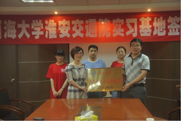 上午,队员们在张继勋老师的带领下来到了淮安市交通设计院,魏副院长对小分队进行了接待,并当即举行了一个简单的会议,简单介绍了交通设计院的职能,让队员们从一个新的角度了解到交通对城市发展的重要意义。他强调,作为水之子,希望队员们能发扬老一辈的光荣传统,踏实学好专业知识,将来能更好地发展自己,报效祖国”,并表示希望以后有河海的优秀学子前来实习及工作。随后,魏副院长和张继勋老师,与队员们一起举行了实践活动基地的挂牌仪式。