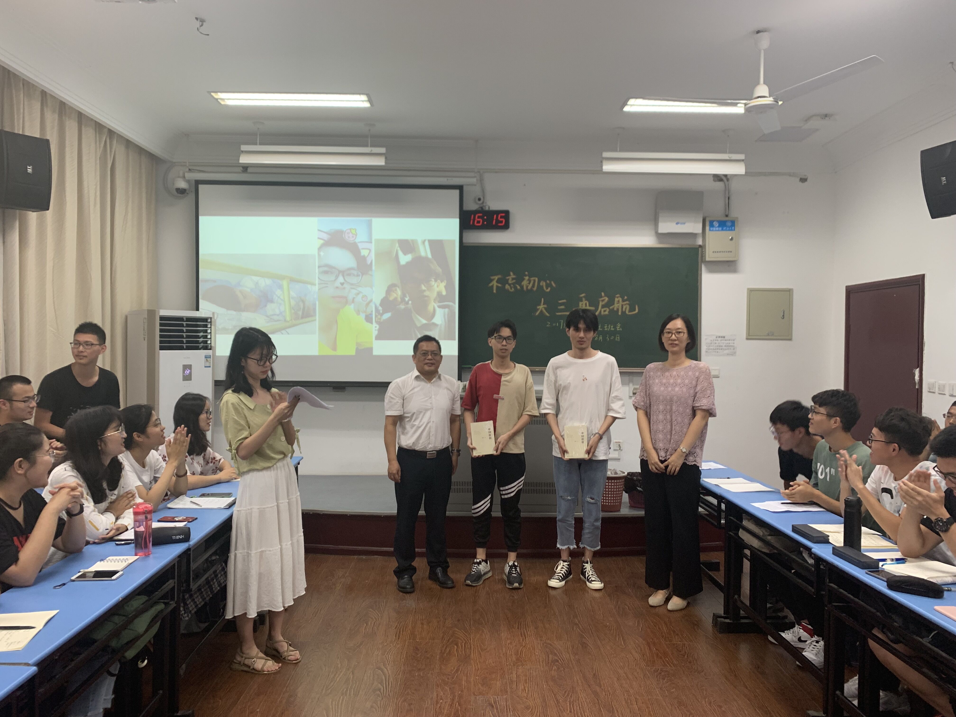 党委书记任旭华参加所联系的学生班级:17级水工1班“不忘初心,大三再起航”新学期班会,与同学们进行座谈。任书记对同学们上学期取得的各项成绩表示肯定和祝贺,结合学院的人才培养目标和发展方向,对同学们提出宝贵的建议和希望,并对同学们提出的就业、升学等相关问题进行了详细的解答。班会结束后,任旭华书记与张汉云老师向转至水建管班级的两位同学赠送了纪念品,鼓励同学们不忘初心,迎帆再起航。