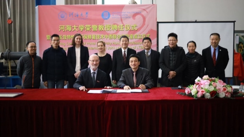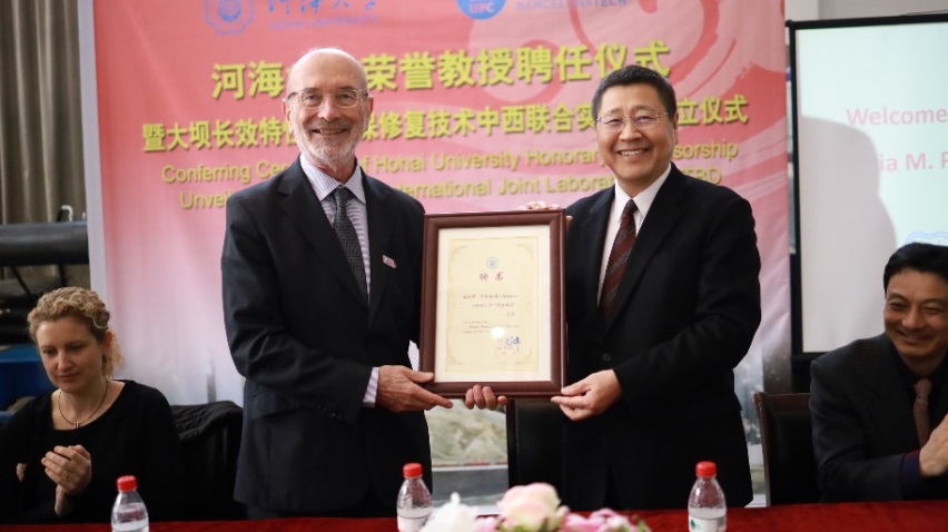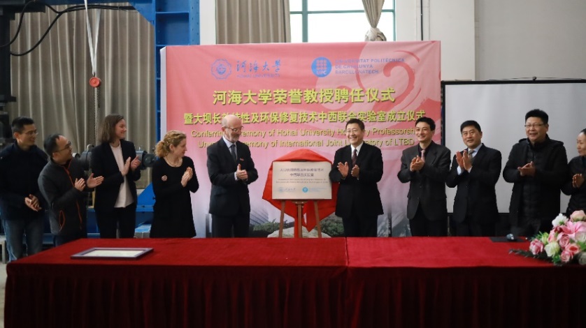 12 月 13- 14 日,由学院承办的大坝长效特性及环保修复技术中西联合实验室成立仪式在水电学院水工结构研究所试验大厅顺利举行。副校长徐卫亚、国际合作处副处长陈红胜、科技处副处长王建、人事处副处长刘宇琳、水电院副院长沈振中等出席了成立仪式。水工结构研究所所长刘斯宏教授主持了成立仪式。徐卫亚副校长代表学校向联合实验室首席科学家 Eduardo Alonso 教授颁发荣誉教授聘书,欢迎 Eduardo Alonso 教授加入av影片 ,希望其为学校教学、科研以及国际化人才培养作出积极贡献。刘斯宏教授介绍了 Eduardo Alonso 教授简历和学术成就。