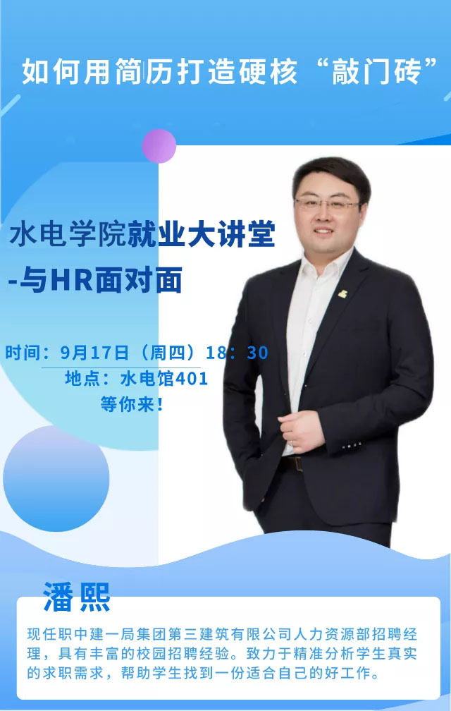 9月17日,为提升av影片 毕业生的就业竞争力,帮助毕业生了解简历制作的知识和技巧,学院举办了“水电就业大讲堂”之与HR面对面系列讲座,邀请中建一局集团第三建筑有限公司人力资源部招聘经理潘熙,以《如何用简历打造硬核“敲门砖”》为题,为毕业生开展了一场既生动又实用的培训。党委副书记王方主持讲座。