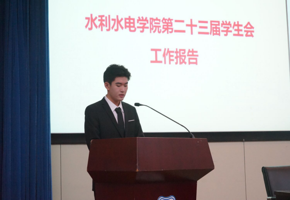 院学生会主席李新同学代表二十三届学生会作了题为《不忘初心砥砺前行,全心全意为人民服务》的工作报告。在过去的一年中,水电院学生会以习近平新时代中国特色社会主义思想为指导,从思想引领、组织建设、校园文化、权益维护等多个领域,服务广大学生成长成才,在多方面取得了一些成绩,并对未来一年的工作提出要求,不断深化组织改革,建设服务型学生会,为实现两个100年奋斗目标和中华民族伟大复兴的中国梦贡献青春力量。