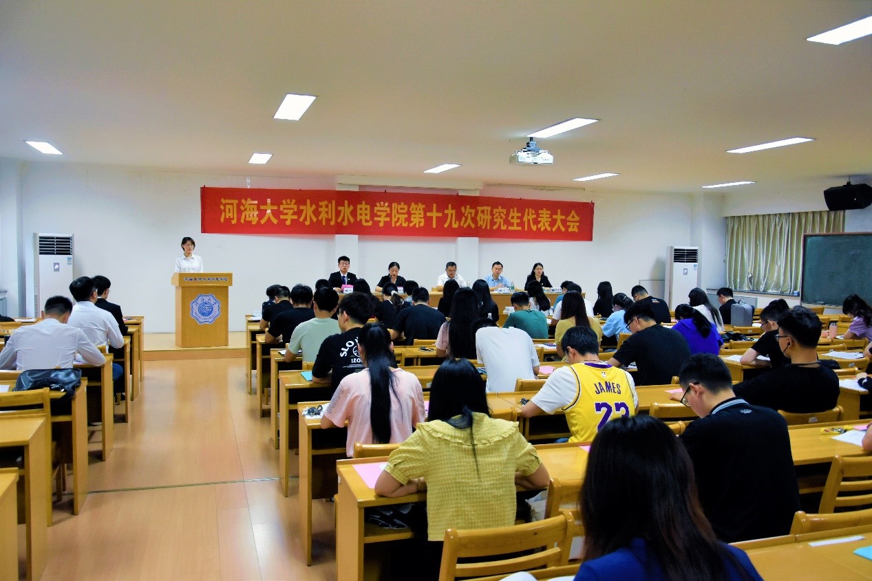6月3日,av影片 隆重召开第十九次研究生代表大会。院党委书记任旭华、校研究生会执行主席赵嘉雯出席会议并讲话,党委副书记王方,团委书记笪步源,组织员胡瑞媛,研究生教学秘书周昶,研究生辅导员赵志涵、陈思思,本科生辅导员姜帆,水文学院、港航学院、环境学院等兄弟学院研究生会负责人及av影片 研究生会代表60余人出席大会。