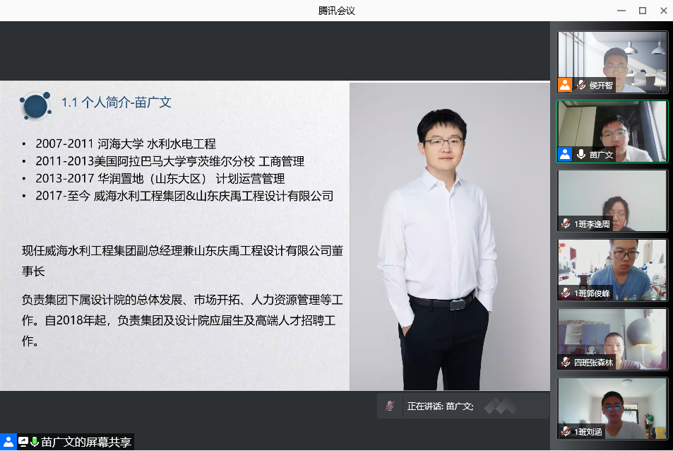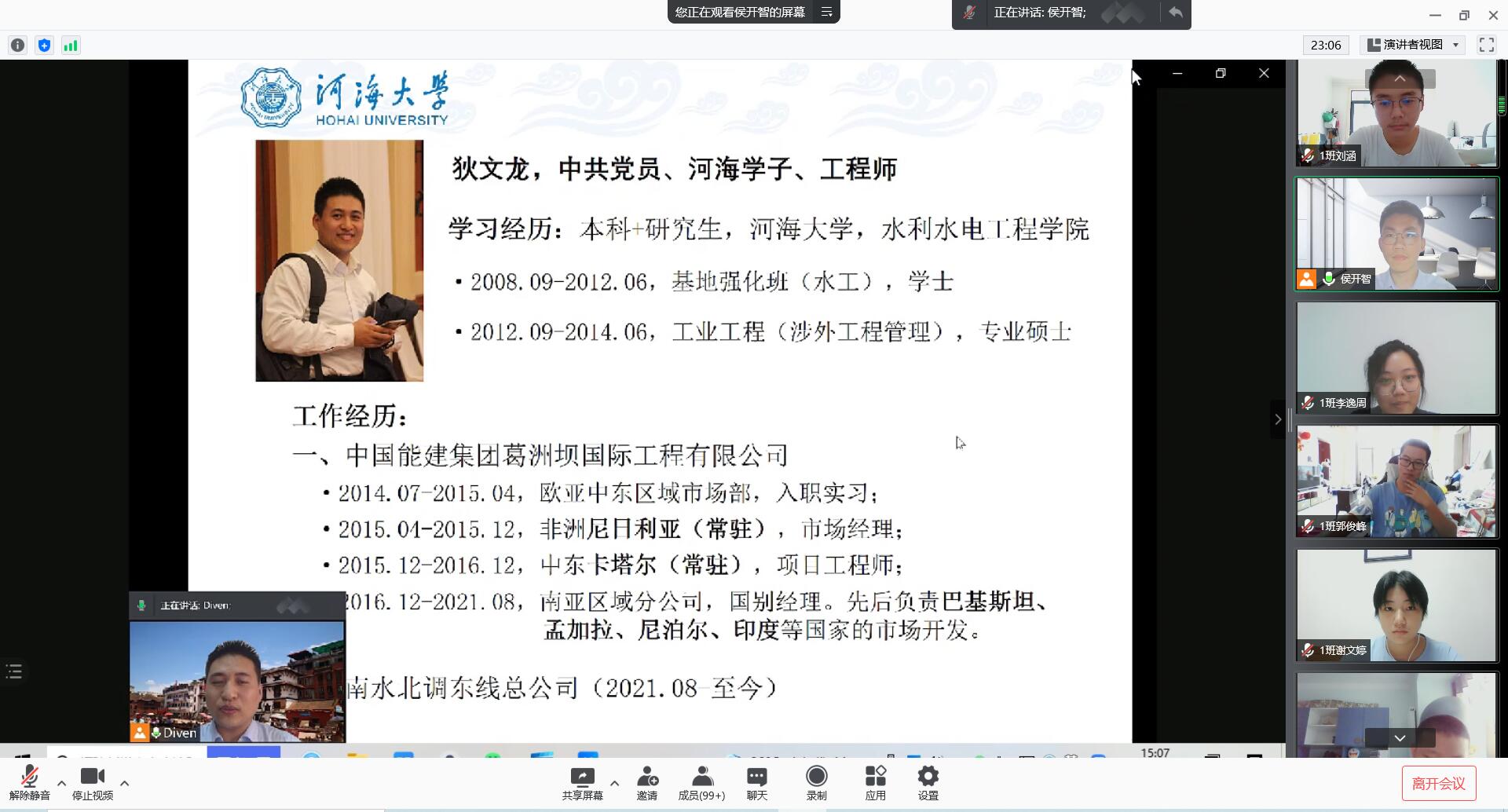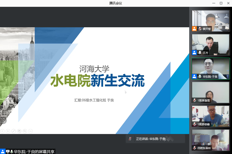 12日下午,2021级扬帆·大学生涯起航周活动之“传承·我的大学”线上交流分享会顺利举行,2021级全体同学、辅导员侯开智参加分享会,院党委副书记王方主持会议。分享会邀请浙江省水利发展规划研究中心刘志伟,华东勘测设计研究院有限公司履约支持中心-能源电力与水利室主任于良,威海水利工程集团副总经理兼山东庆禹工程设计有限公司董事长苗广文,中国能建集团葛洲坝国际工程有限公司国别经理狄文龙,清华大学水利水电工程系博士生曹园,五位优秀校友分享他们在av影片 就读时的精彩大学生活,并结合各自的经历,从不同角度给学弟学妹分享宝贵经验。