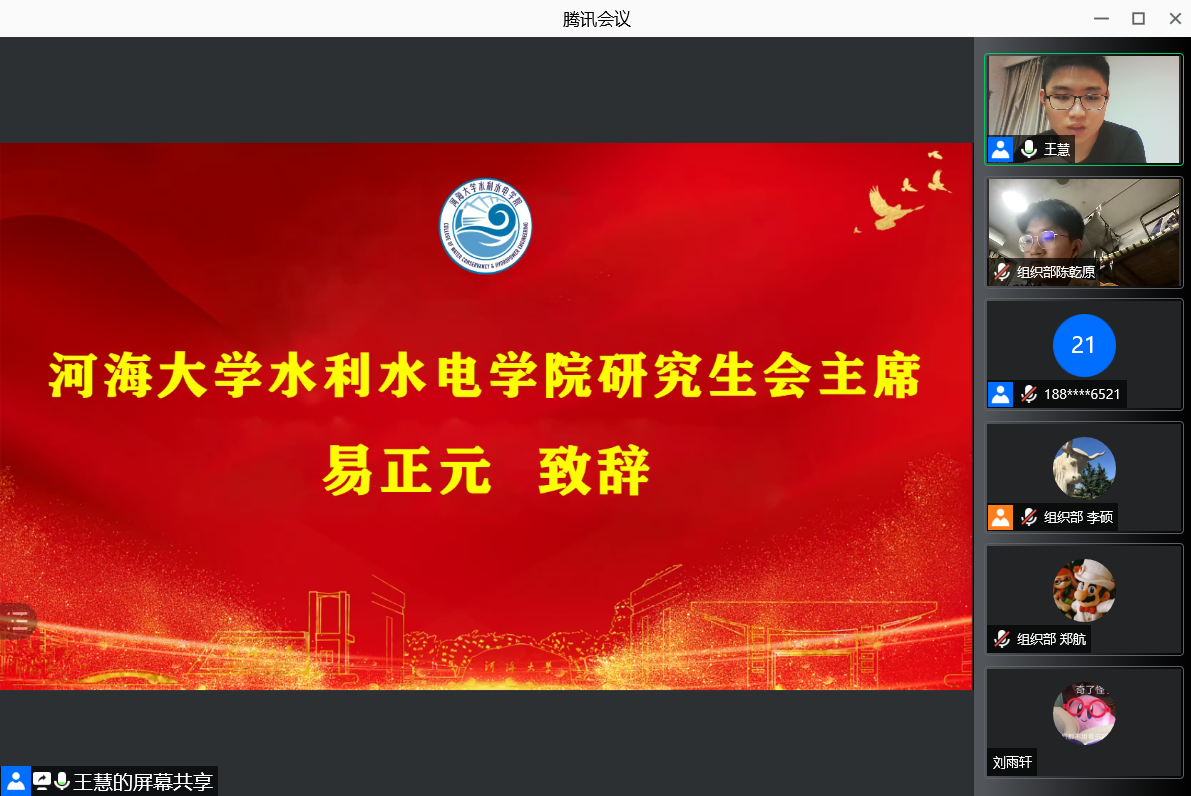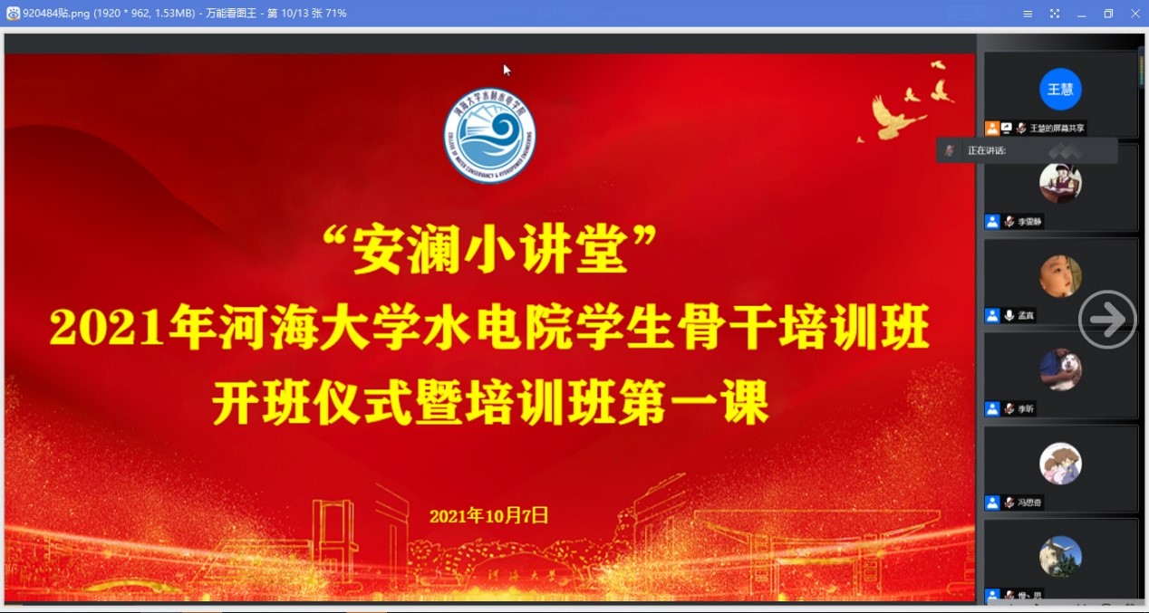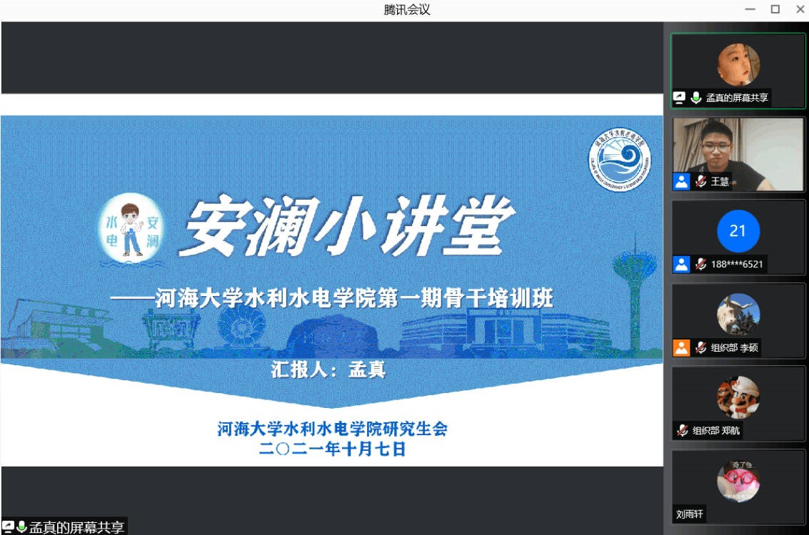 10月7日,“安澜小讲堂”——2021年av影片 水电院学生骨干培训班开班仪式暨培训班第一课在线上召开。av影片 研究生会主席团成员金子又、av影片 水电院研究生会主席易正元、副主席高阳、冯思奇及部长团成员出席本次培训,水电院第十九届研究生会全体成员及第二十四届学生会部分成员参与本次活动,活动由秘书处王慧主持。