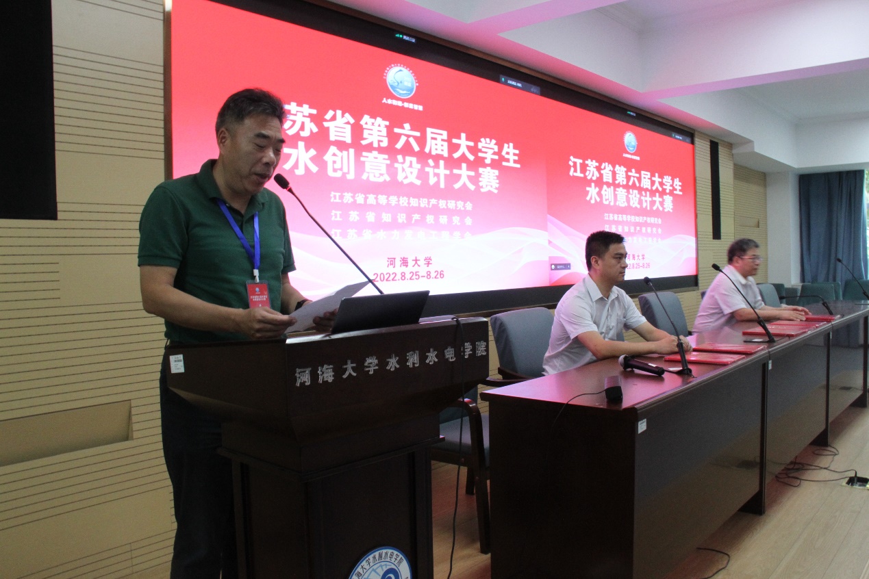 江苏省高等学校知识产权研究会葛少卫秘书长、江苏省知识产权研究会王亚利秘书长、江苏省水力发电工程学会李同春秘书长出席大赛,大赛由王建副院长主持。李同春秘书长代表主办单位致辞,向参会领导、嘉宾以及参赛指导教师和学生表示热烈的欢迎和衷心的感谢,具体介绍了本次大赛的参赛队伍、作品情况及大赛评审规则,鼓励各位青年学子大胆创新,锐意进取,为新时期水利高质量发展做出自己的贡献。