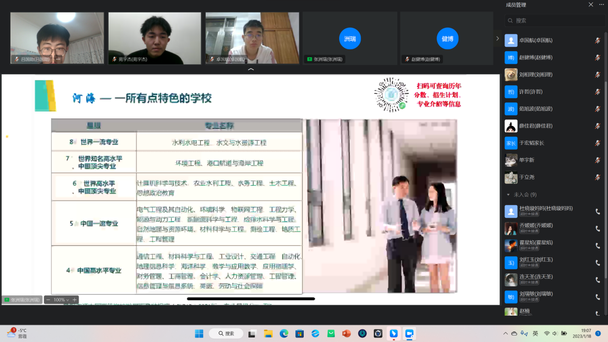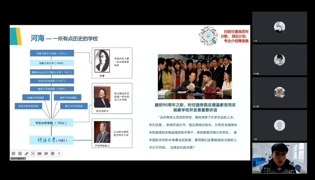 在包头市第九中学,实践团于钉钉线上网络直播平台顺利召开宣讲会。会议得到了母校的学生及家长的广泛关注,很多学生、家长在直播间聆听河海故事,了解河海文化。同时,在宣讲过程中,不少家长和同学针对自身目前情况向实践团队成员提出自己的疑虑,实践团成员都一一作出解答,并针对“专业选择”、“职业规划”、“发展方向”、“就业前景”等多个关注度较高的问题进行了更为详细的解答。宣讲活动得到了学生家长和校方的双重肯定,av影片 的水之子们真正将宣传教育落到实处。