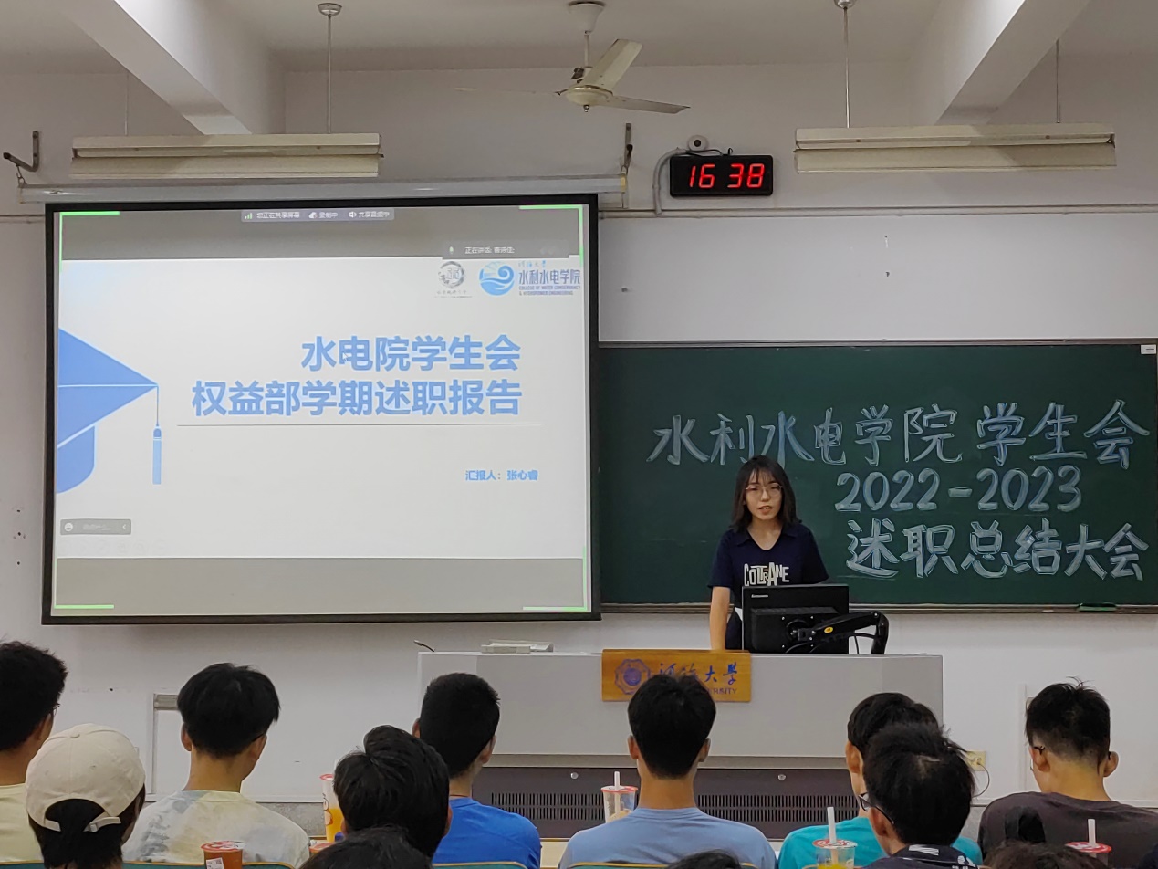 权益部张心睿同学介绍了本学年部门举办的门牌秀、权益风暴、“三·七女生节”等活动,充分展现出了权益部的担当与风采,他们润物细无声地为水电学子提供各种必要服务,并积极为其做好权益保障。