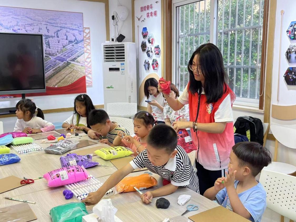 在志愿者们的带领下,小朋友们拿起手上的各色粘土,充分发挥了自己的想象力,做出了树木、房子、小动物等模型,装饰在了都江堰模型之上,与志愿者一同完成了都江堰基本模型装饰,展现了小朋友们对长江周边环境的美好想象。