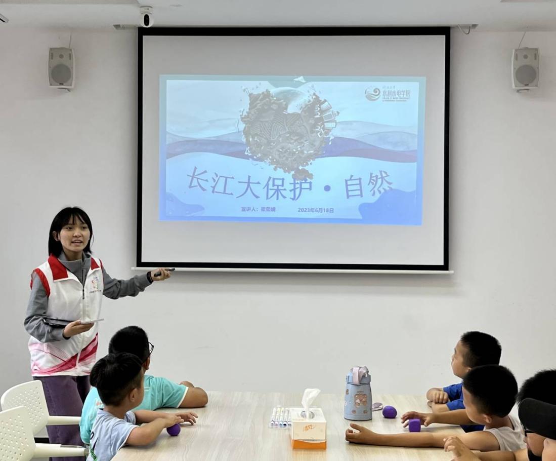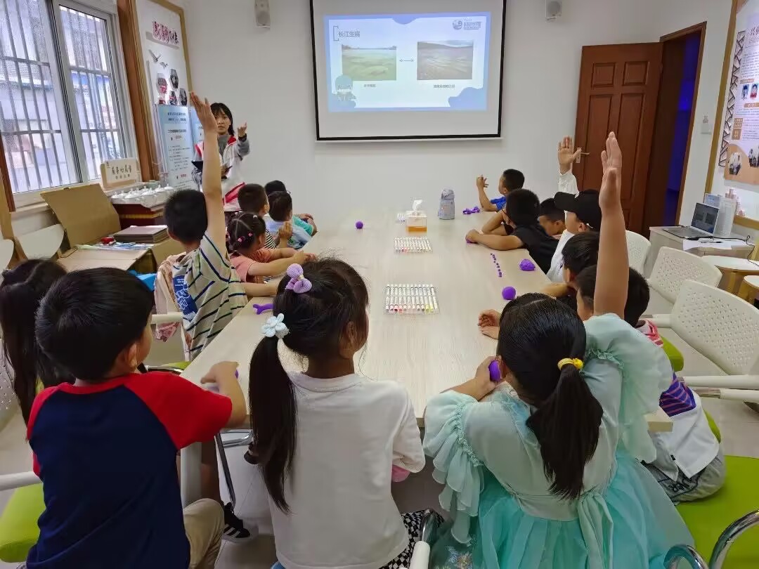 实践团成员结合丰富的PPT,通过生动的语言介绍了讲解长江大保护对于栖息动物的重要性、长江大保护治理前后的情况变化、长江大保护中“水污染治理”与“水林田湖一体化”两项基于自然环境情况的处理办法,最后教育小朋友惜水、护水、爱水,培养其生态保护意识。小朋友们积极回答宣讲人的提问,展现出对长江的好奇与保护长江的热情。