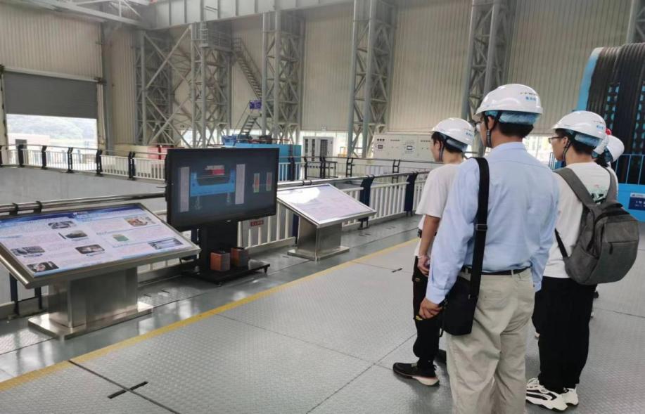 团队成员在两位校友的带领下,参观了华能景洪水电站的监测控制中心、水轮机室、发电机室、廊道以及世界首台水力驱动式垂直升船机。通过实地参观调研,实践团逐步了解了水电站的构造和各个装置的工作原理,尤其是在智慧水利建设当下,水电站已实现全面国产化升级,做到自动化管理和无人值守。
