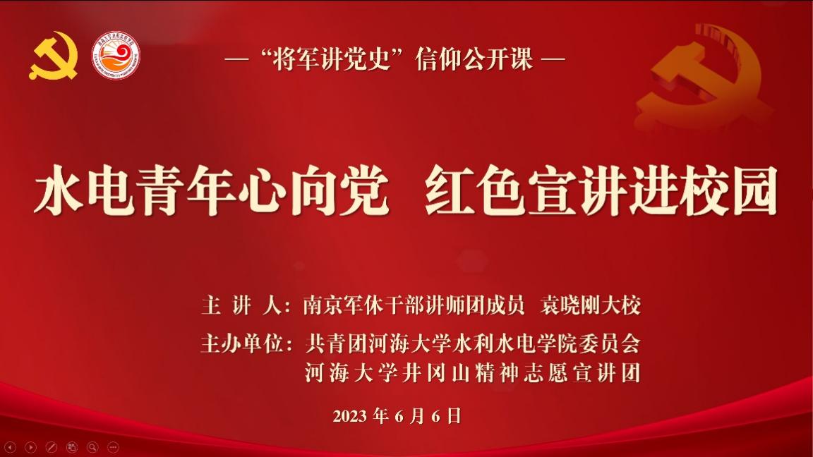 今日参加了以“水电青年心向党,红色宣讲进校园”为主题的“将军讲党史”信仰公开课,党课由袁晓刚大校讲授,我受益匪浅。通过对党史的学习,回首共产党波澜壮阔的发展历程与革命先辈争取和平与胜利不懈奋斗的先进事迹,我认识到共产党是一个伟大而英明的政党,深知革命先辈为后人今天的幸福付出了无尽的努力,甚至是鲜血和生命,他们是后人学习的楷模,是我们心中永远的英雄和伟人。