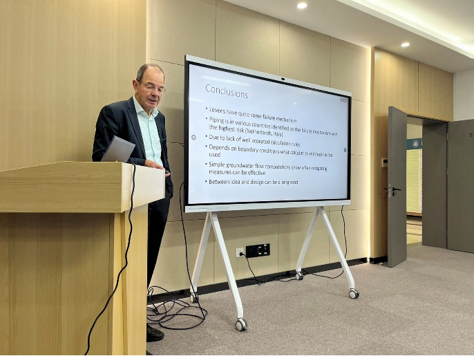 Adam Bezuijen教授应邀做了题为“堤防工程后向侵蚀型管涌机理及防治措施”的特邀报告。Adam Bezuijen教授分析了世界范围内堤防管涌问题的典型案例,讲解了堤防管涌的发生发展机理和预测评估方法,并介绍了荷兰堤防工程管涌防治措施的最新研究成果和先进经验。