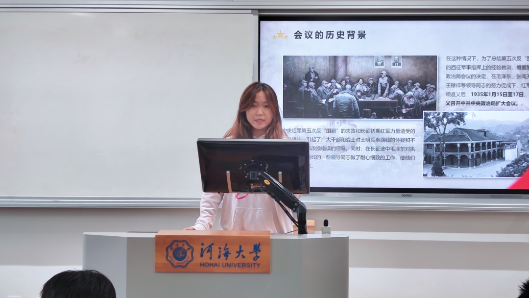 2022级水工一班团支书王尧以中国共产党的发展脉络为主线,向同学们介绍了上海一大会址及天安门广场,并带领同学们领略其背后所蕴含的丰富精神内涵。2022级水工二班团支书王嘉怡以遵义会议的历史背景、过程及意义为主要内容,向同学们介绍了遵义会议在中国共产党历史上的重要地位。