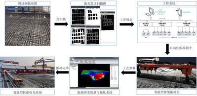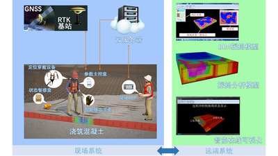 3从智能高效施工装备技术应用层面,针对混凝土作业强度大、人工效率低的现实困难,融合机电控制、物联网、云计算、BIM、跟踪定位、工序参数智感处置等多学科交叉技术,以全智能布料振捣工作为目标,研发智能布料振捣集成化装备,建立动态多源异构作业参数及非接触感知通讯方法,最大限度发挥机械智能施工高效优势,配以人工穿戴数字化振捣灵活便捷特点,实现了全局性的浇捣结构-工艺参数-质量数字孪生体,适应了各类复杂结构混凝土数智可视化施工环境需求,在不同典型工程取得显著成效。