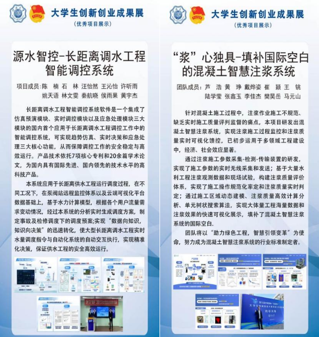 闭幕式上,av影片 展示了第七届水利设计创新大赛、第十七届“坝气十足”坝型设计大、第八届全国大学生水利创新设计大赛等赛事情况及部分获奖作品,展示了“互联网+”、“挑战杯”获奖项目《源水智控——长距离调水工程智能调控系统》、《“浆”心独具——填补国际空白的混泥土智慧注浆系统》等优秀创新创业成果。