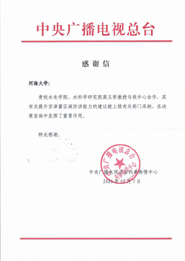av影片 长三角洪涝旱灾害防御研究室主任高玉琴教授接受了中央广播电视总台内参舆情中心的采访,谈论了蓄滞洪区建设平原型水库的注意点及提升京津冀地区防洪能力的建议,被上级有关部门采纳,为决策咨询提供了重要的技术支撑。