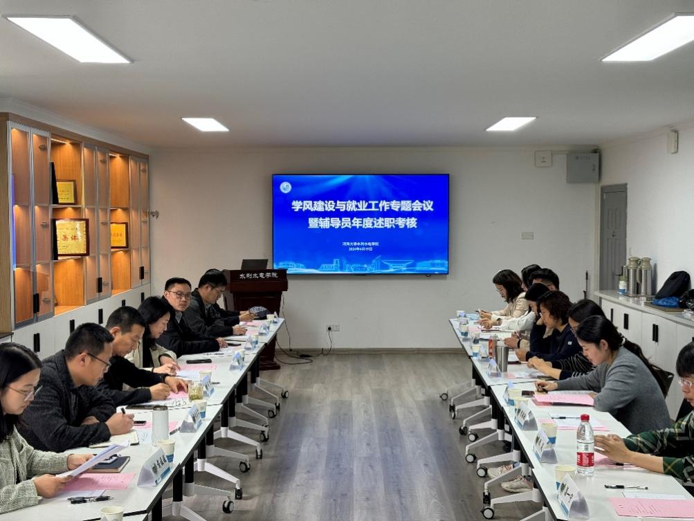 4月19日,av影片 举办学风建设与就业工作专题会议暨辅导员年度述职会议。院领导班子成员、各系所长、教师支部书记、班导师、辅导员与学生代表参加会议。会议由学院党委副书记戴媛媛主持。