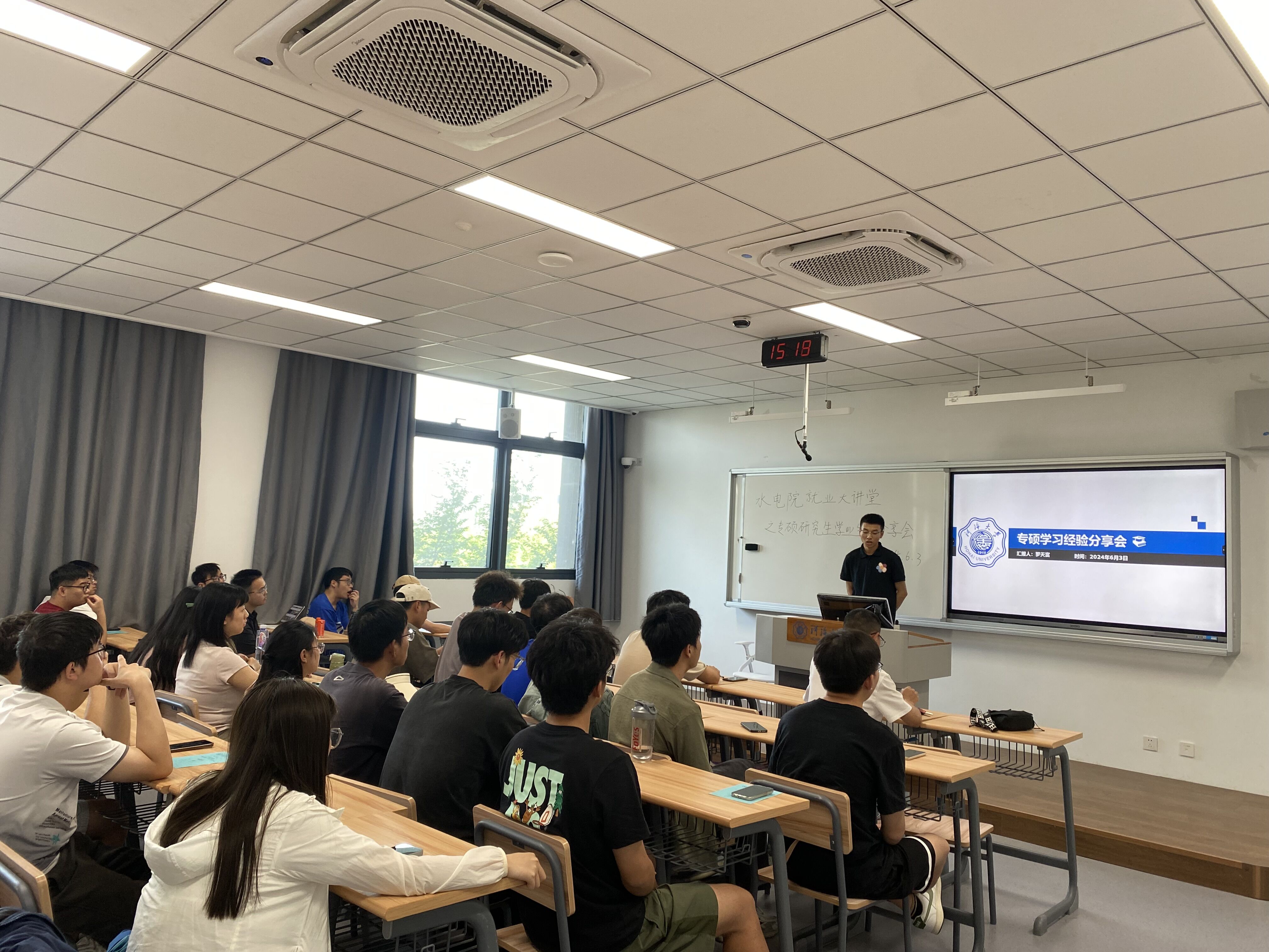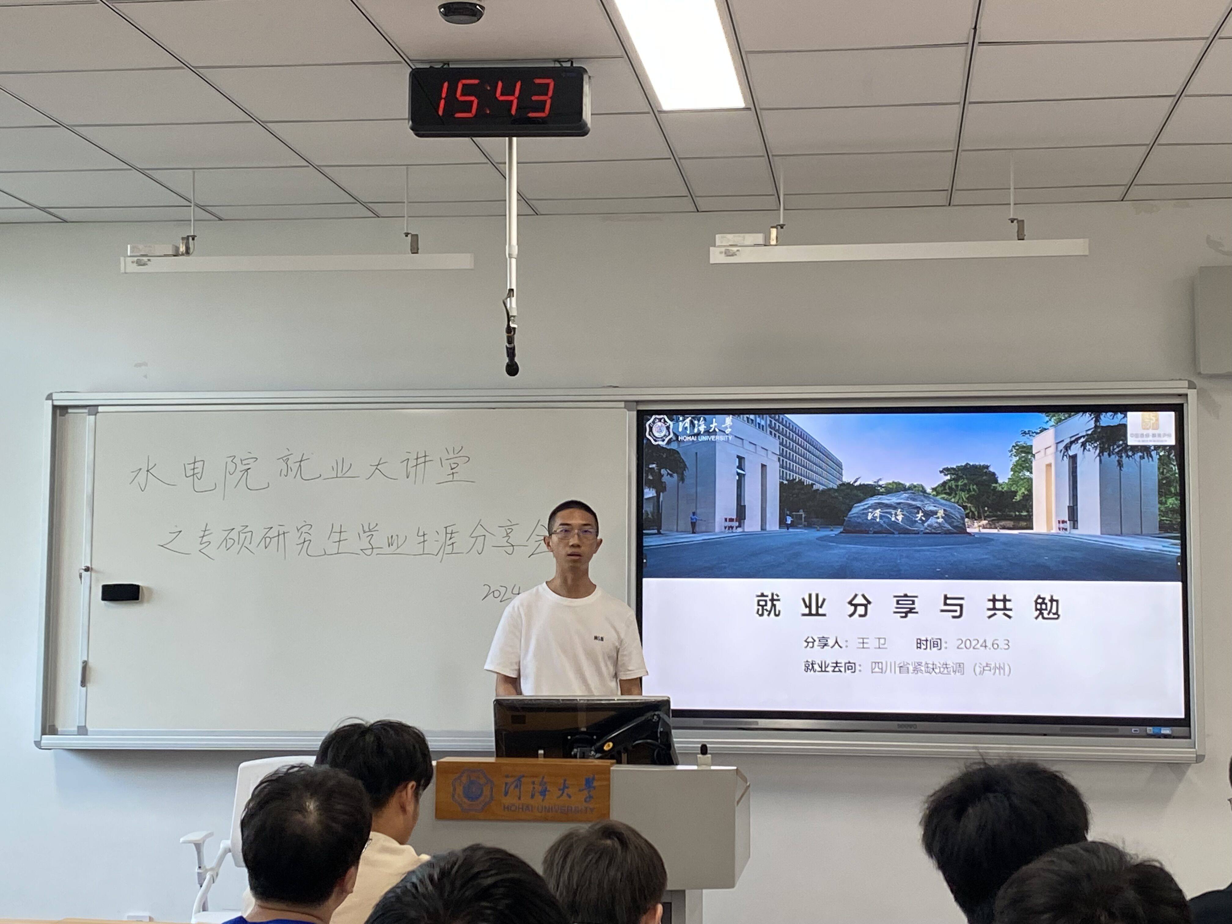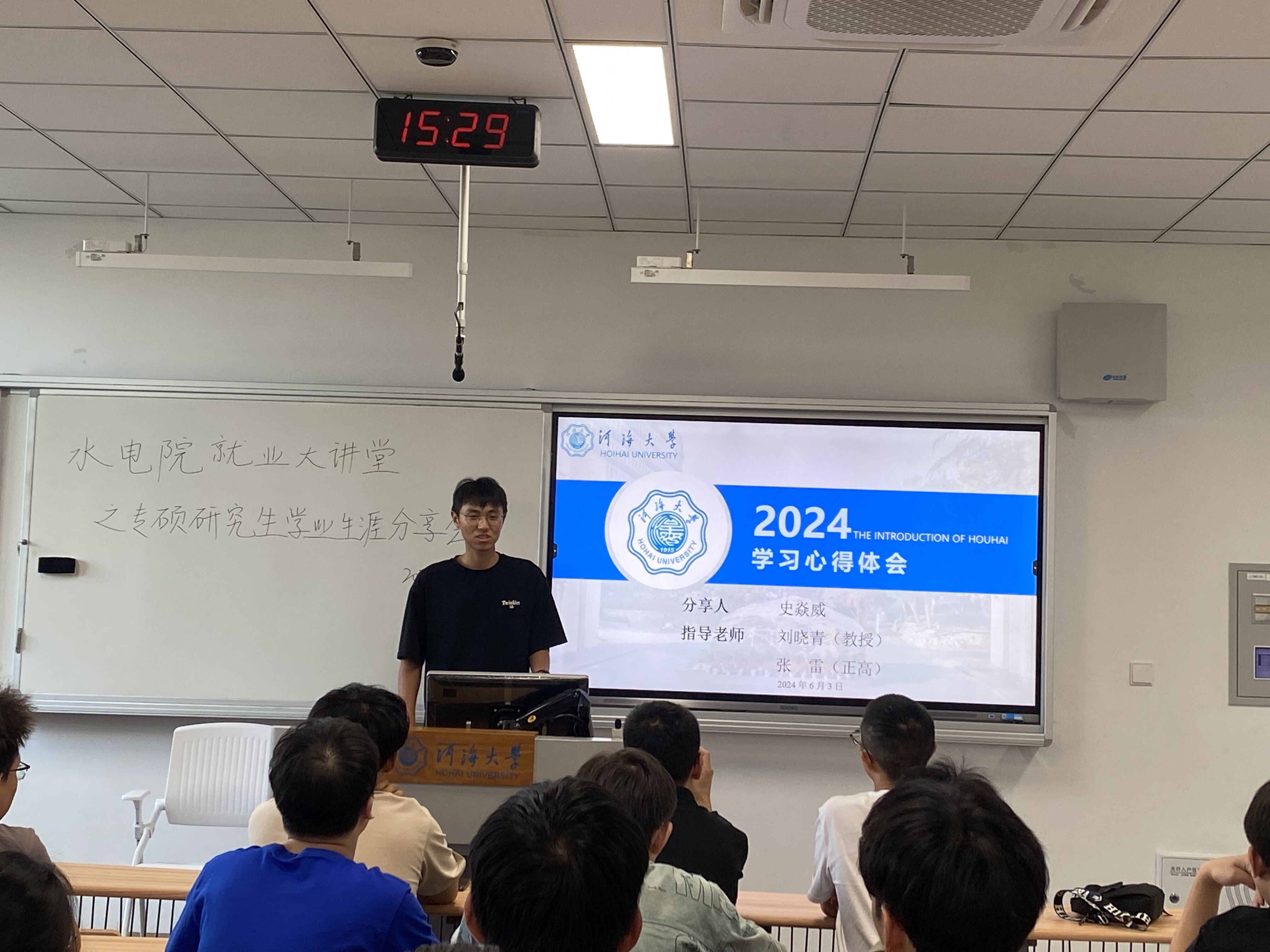 学院2023级专硕研究生即将前往研究生联培基地顶岗实习,为进一步引导同学们合理规划学习生涯,6月3学院在金坛校区举办水电就业大讲堂之专硕研究生学习生涯分享会。本次活动邀请了学院2021级土木水利专业罗天富史焱威和王卫3研究生师兄面向学院2023级土木水利专业研究生做分享,活动由辅导员陈辰老师主持。
