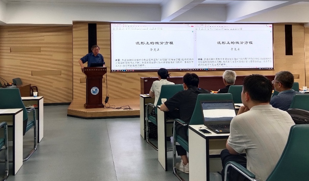 首都师范大学李克正教授应邀做了题为“流形上的微分方程”的主题报告。报告首先介绍了常微分方程解的唯一性,然后深入浅出的介绍了数学中的“流形”概念,并对切空间和向量场进行了解释。在此基础上推导了流形上的自治微分方程和流形上微分方程的整体解,从而对时空大范围上的微分方程给出了基于流形的数学刻画,最后以一个刚体动力学的例子进行举例应用。