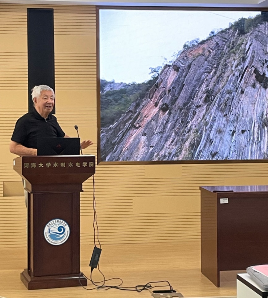 数值流形方法创始人,美籍华人科学家石根华先生应邀做了题为“非连续计算与稳定分析”的主题报告。石先生首先对岩石这种介质的非连续特性进行了介绍,对DDA与FEM、NMM、DEM、KBT间的内在关联进行了解释,着重介绍了DDA的基本原理和收敛准则,又对石先生提出的块体接触理论和单纯形积分进行了深入解析,最后引出了NMM的连续-非连续统一计算原理,并介绍了这些方法在隧洞和边坡工程中的实际应用。