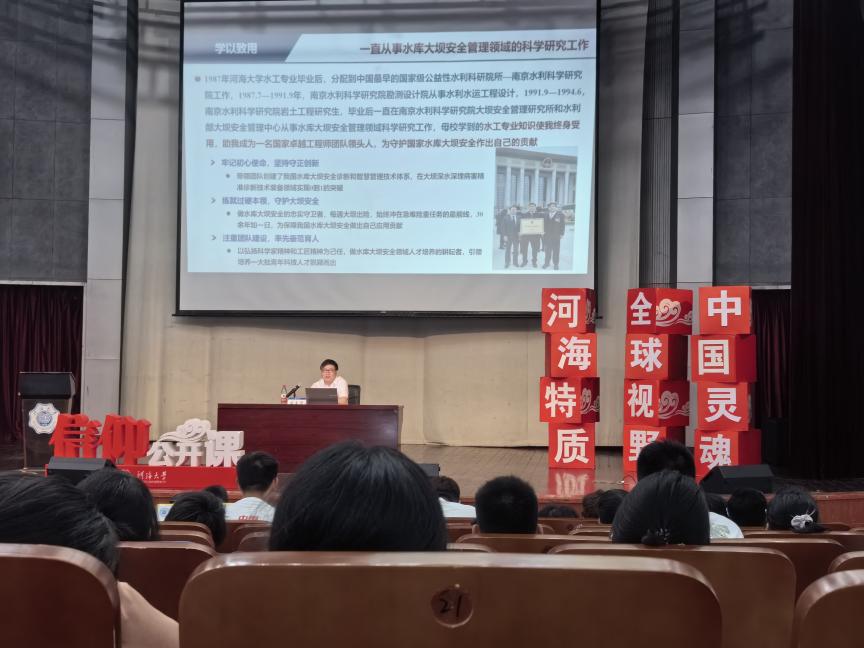 盛金保校友现任水利部大坝安全管理中心总工程师、南京水利科学研究院大坝安全与管理研究所所长,兼任av影片 教授,领衔团队荣获首届“国家卓越工程师团队”等荣誉称号。分享会上,盛教授以“学以致用,为水库大坝安全保驾护航”为主题,向新生们详细讲述了水库大坝在国家水安全和公共安全中的重要性,强调了保障大坝安全是水利学子的责任和使命。