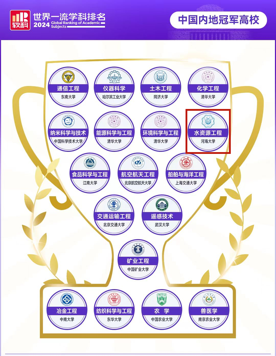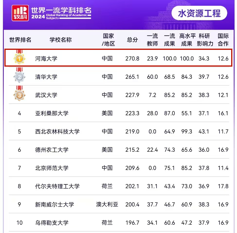 日前,高等教育评价专业机构软科正式发布2024“软科世界一流学科排名”(ShanghaiRanking's Global Ranking of Academic Subjects),我校“水资源工程”学科自2022年以来蝉联全球第一。