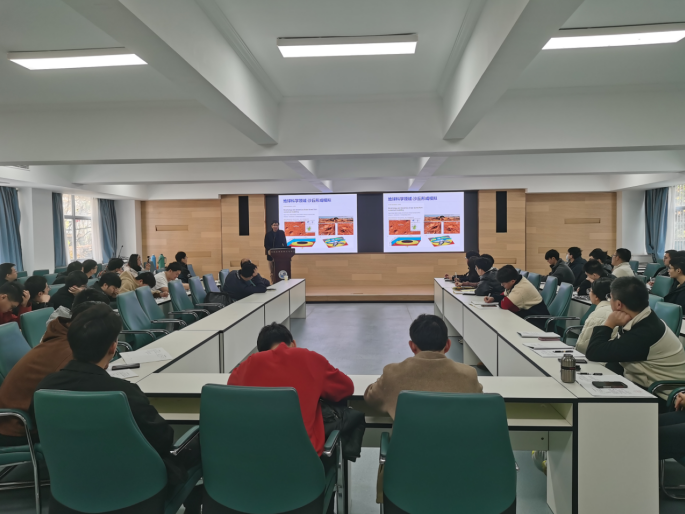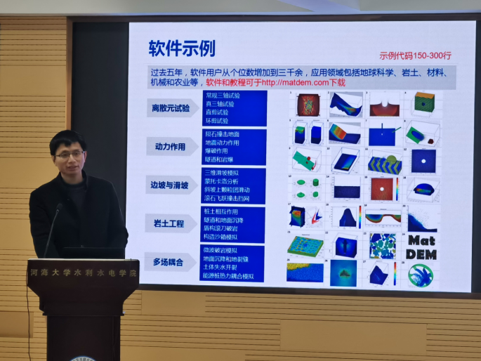 报告聚焦颗粒物离散元数值模拟方法及其应用。颗粒在物质世界中广泛存在,从微小的粉末、细砂到石子和岩石。大量颗粒的接触和相互作用可以产生非常复杂的整体力学行为。离散元法实现了复杂颗粒系统的仿真,已在地质灾害、岩土工程、化学加工、农业和制造业等领域中得到广泛应用。刘春教授团队基于原创的矩阵离散元计算法和多场耦合理论,研发了高性能的离散元软件MatDEM,实现了数百万颗粒的计算机仿真。通过工程地质智能仿真,支持华为公司、宁德时代、中国航天等企业的先进制造和产业升级。与av影片 智慧水利、安全科学与工程相关学科研究高度契合,受到参会老师和同学的热烈欢迎。在交流研讨环节,青年教师和研究生与刘春教授围绕离散元方法、工程应用难点等问题开展了热烈的学术互动。