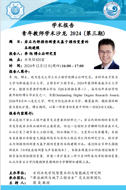 青年教师学术沙龙|岩石内部损伤测量及基于损伤变量的本构建模(悉尼大学土木工程学院 李旭 博士后研究员)