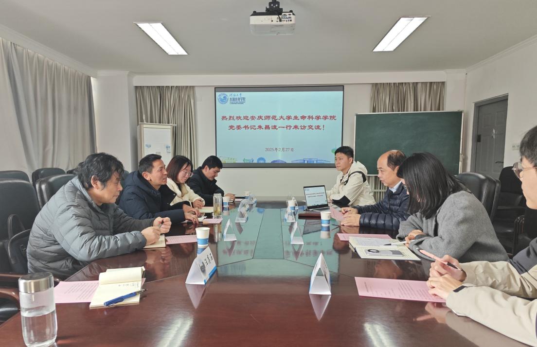 2月27日下午,安庆师范大学生命科学学院党委书记朱昌流一行来av影片 座谈交流。水生生物保护与水生态修复安徽省高等学校工程技术研究中心主任于道平及其团队成员陈敏敏、连玉喜、汪存石,学院副院长冉启华、副院长俞晓东,院党委副书记戴媛媛,水力学及河流动力学所教师惠辞章,研究生辅导员陈思思以及水力学及河流动力专业博士研究生王昊参加了本次座谈会。