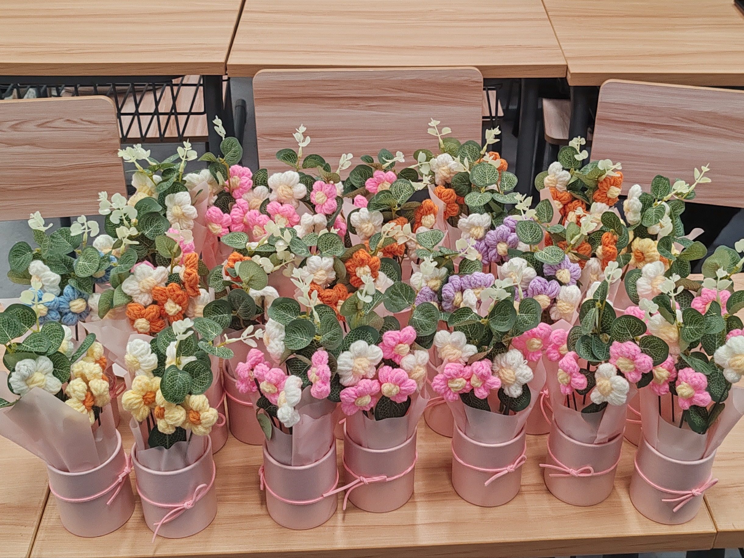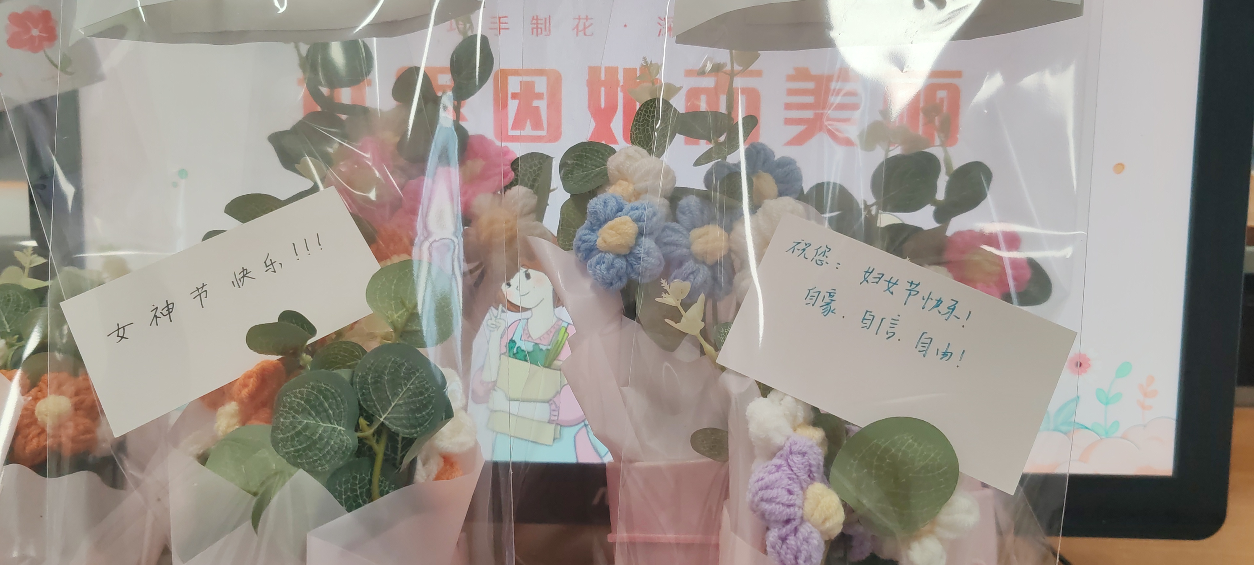 班级团支书苏月萌向同学们讲解国际劳动妇女节的由来、发展,并分享克拉拉·蔡特金、何香凝等妇女运动领袖的事迹,展现了一代代女性在争取权利、参与斗争的光荣事迹和独立精神。班级同学每人制作一份钩织花礼物,在贺卡上写下“妇女节快乐!”“祝您自豪、自信、自由!”等祝福语,并将礼物送给宿管阿姨、任教老师作为祝福,以此表达对劳动妇女的感谢和敬重。