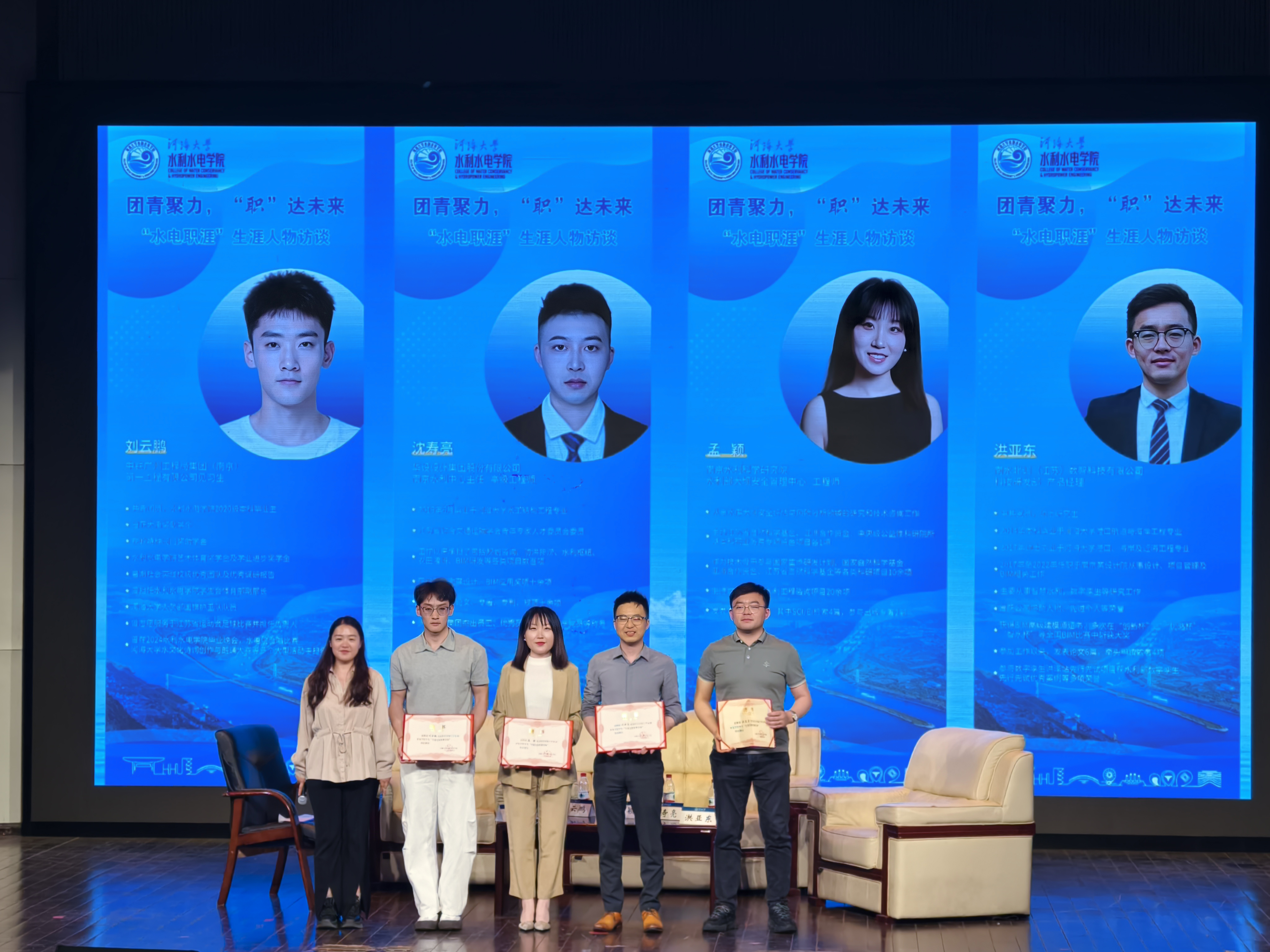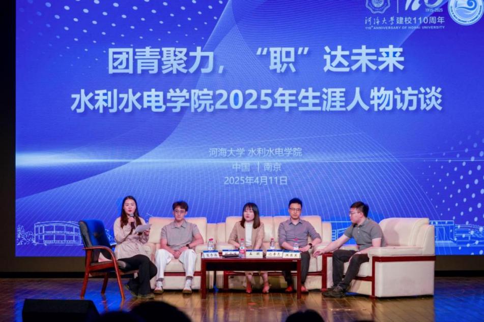 为助力学生明晰职业方向、深化行业认知,av影片 于2025年4月11日晚在博学楼报告厅举办“团青聚力,‘职’达未来”生涯人物访谈活动。活动特邀华设设计集团南京水利中心主任沈寿亮、南京水利科学研究院工程师孟颖、南水北调(江苏)数智科技有限公司产品经理洪亚东、中铁广州工程局见习生刘云鹏四位校友,围绕职业规划、行业趋势与成长路径展开深度对话。四位嘉宾分别来自设计、科研、科技企业与工程一线,其多元背景为在场学生提供了多维度的行业视角。2024级全体本科生参加,访谈由2024级辅导员笪步源主持。