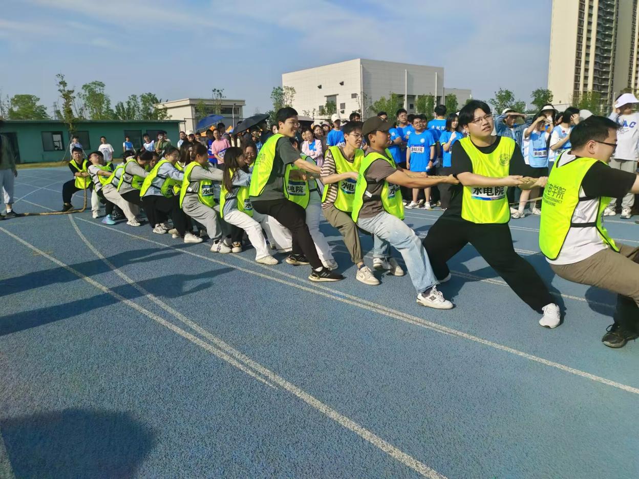 16:00,压轴项目“拔河”将比赛推向高潮。水电院派出10名男生和10名女生,在指挥员的带领下与对手展开激烈较量。比赛开始后,队员们紧握绳索,身体后倾,全力向后拉拽。现场加油声此起彼伏,双方僵持不下。尽管水电院最终未能晋级八强,但队员们拼尽全力的表现赢得了对手和观众的尊重。