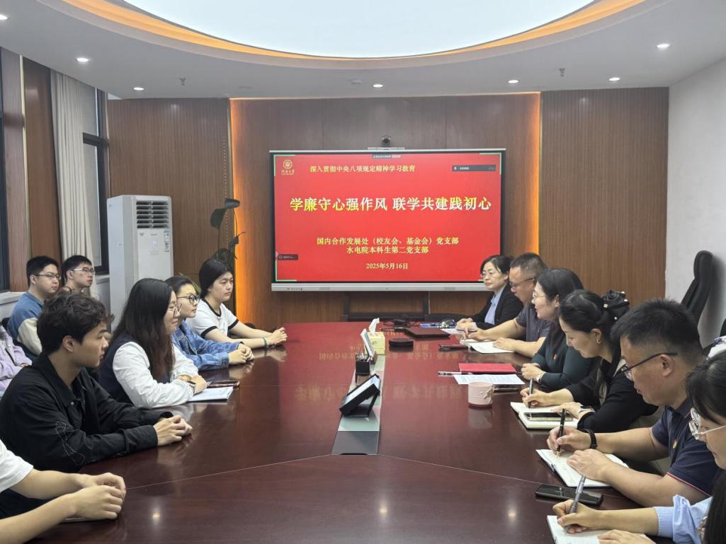 为深入贯彻中央八项规定精神学习教育, 5月16日,av影片 本科生第二党支部与国内合作发展处(校友会、基金会)党支部联学联建,共同开展“学廉守心强作风,联学共建践初心”主题党日活动。党日活动以“理论学”与“实地走”相结合形式开展,分为支部书记讲党课和赴南京溪田勤廉教育基地参观学习两个部分。av影片 国内合作发展处(校友会、基金会)党支部书记赵冰、av影片 水利水电学院本科生第二党支部书记帅雨婷、两支部党员代表参与。