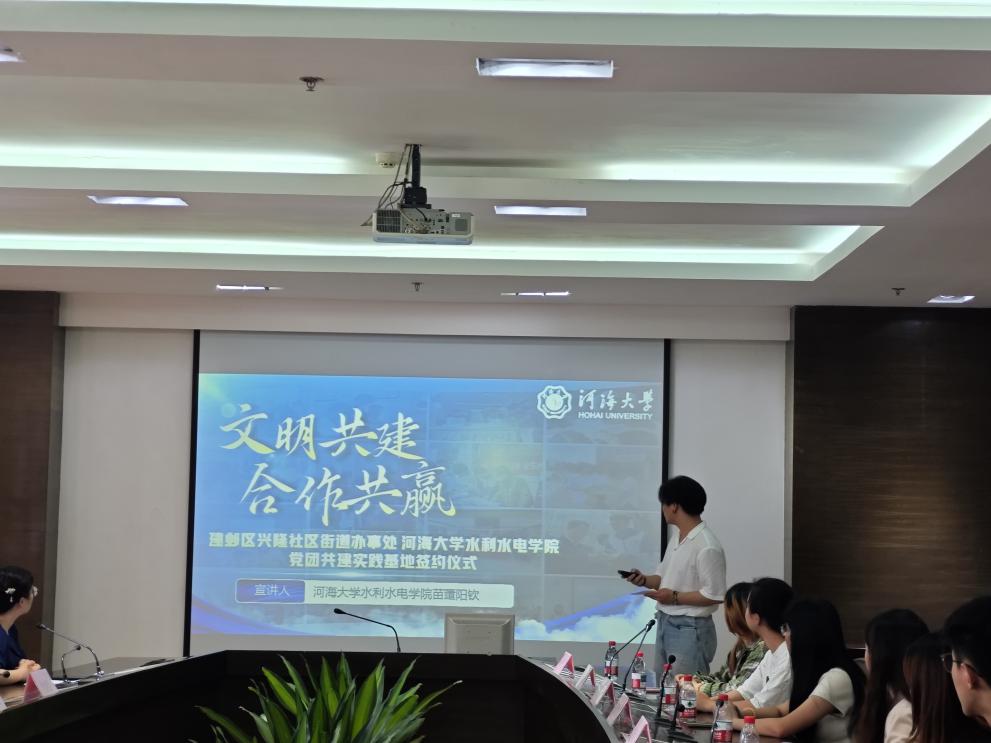签约仪式以“合作共建党团共建实践基地”为主题,建邺区兴隆街道副主任孙如凤、av影片 团委书记笪步源等双方代表出席。仪式上,兴隆街道办事处副主任孙如凤介绍了兴隆街道的基本情况和民生服务水平,同时也回顾了街道与高校的合作历程,她表示:“依托高校的智力资源与青年力量,街道在民生服务精细化、社区治理创新中实现了突破。”av影片 团委书记、本科生第三党支部笪步源介绍了av影片 以及av影片 的基本情况,结合党建引领、团建赋能、水利特色的品牌项目,就此次校地合作交流提出新的想法和思考。她强调:“基地共建是深化产教融合的重要载体,学院团委和本科生第三党支部将以专业优势赋能基层发展,培养兼具理论素养与实践能力的青年人才。”