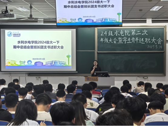 为进一步加强学风建设,营造积极向上的学习氛围,av影片 于5月14日召开2024级期中总结会暨班长团支书述职大会。会议由2024级辅导员笪步源主持,全体2024级学生参加。