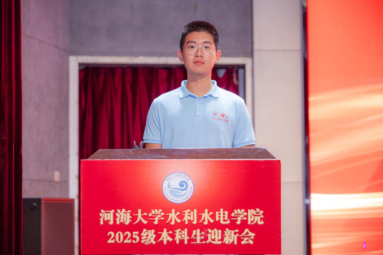 新生代表2025级水利水电工程专业李彦德同学代表全体新生发言,讲述了自己选择河海的历程,围绕大学规划,表达了对未来校园生活的展望。作为建校110周年之际的新生,他表示将与师生共同努力,为av影片 再谱新章。