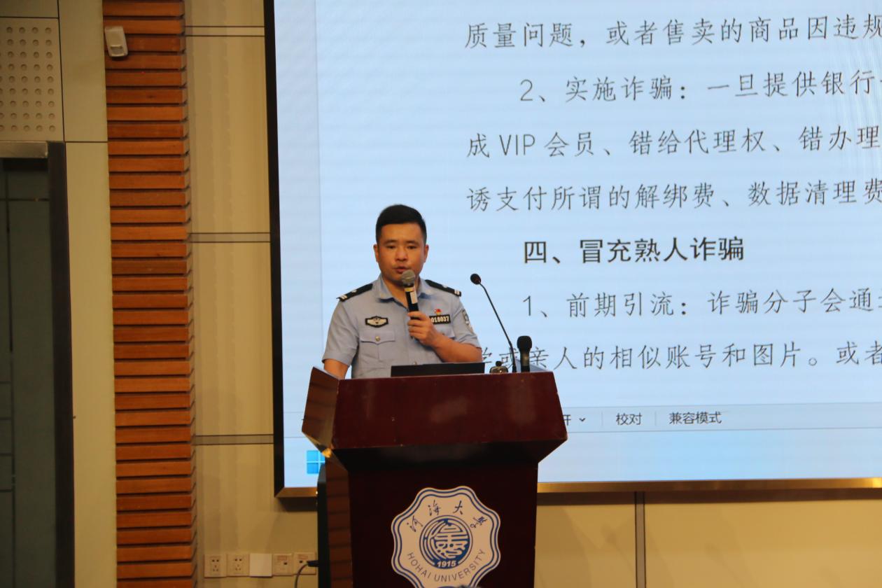 为切实筑牢校园安全防线,9月20日上午,av影片 邀请江宁开发区派出所曹警官在江宁会议中心二楼,为2025级新生举办了一场反诈专题讲座,由2025级本科生辅导员侯开智主持,352名2025级全体新生参加。