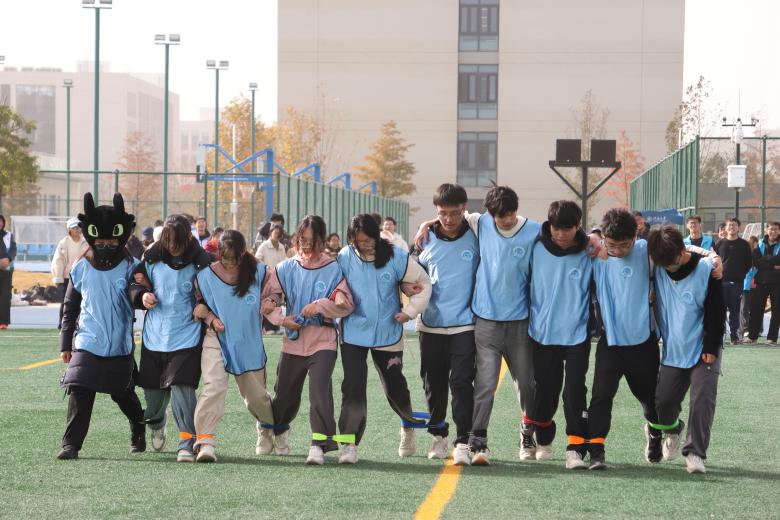 响亮的口号在赛场上回荡。十名队员并肩而立,绑带将他们的脚步紧紧相连。他们必须心往一处想,劲往一处使,将个人的步伐融入集体的节奏。这是对信任与默契的终极考验,他们用整齐划一的步伐,生动诠释了“团结就是力量”。