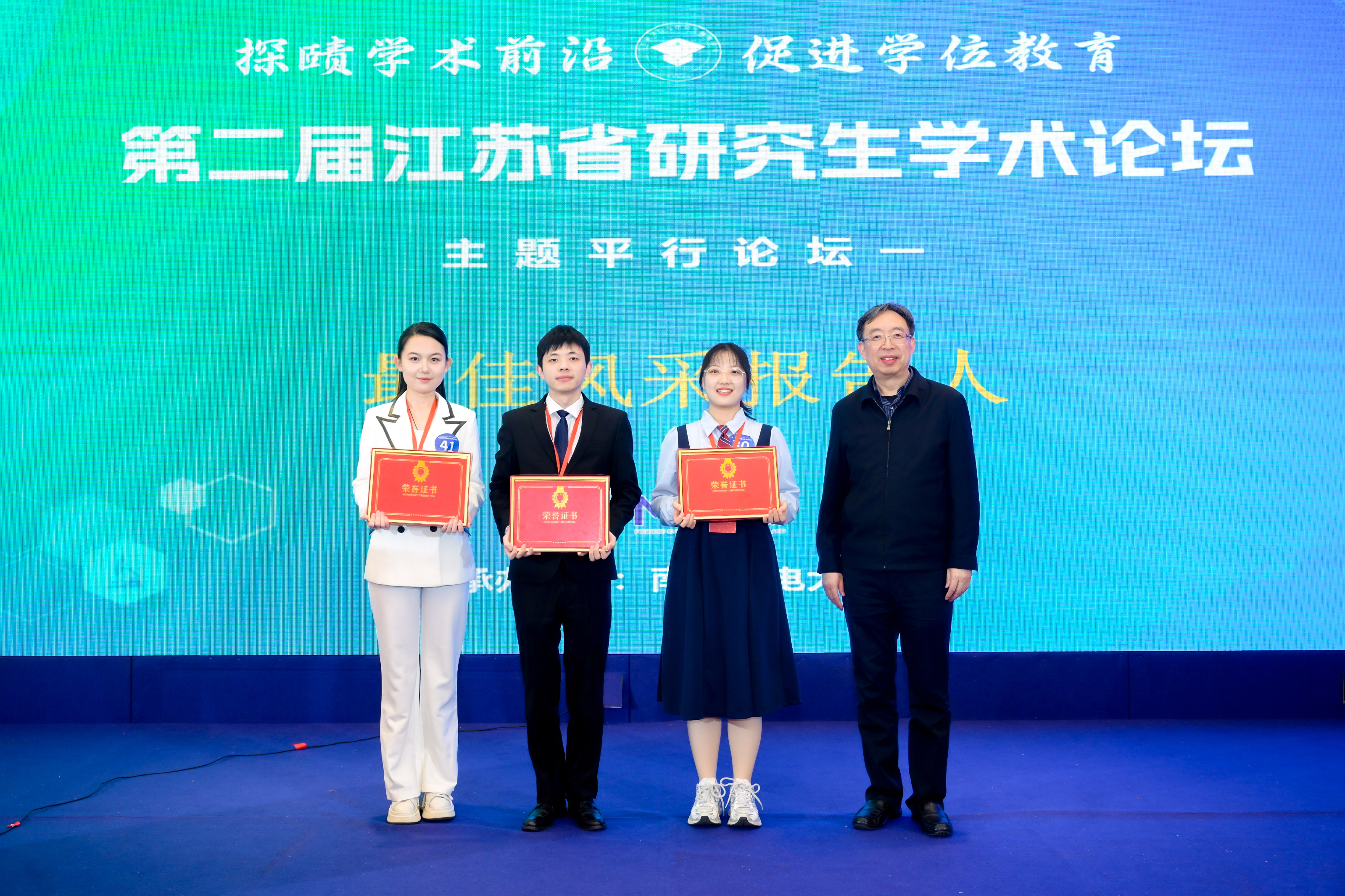 12月24日,第二届江苏省研究生学术论坛在南京成功举办。本届论坛在江苏省教育厅的指导下,由江苏省学位与研究生教育学会主办、南京邮电大学承办,引进了国际学术界通用的“三分钟论文演讲”(3MT)展示模式,强调在极短时间内清晰、生动地阐述科研工作的价值与发现,突出跨学科融合、科研普及与表达能力并重的指导思想。本届论坛由江苏省教育厅原厅长葛道凯、南京邮电大学副校长谢平等多位资深专家担任评委,av影片 谷宇同学代表学校参加论坛并获评“最佳风采报告人”和“优秀学术报告”奖,江苏省教育厅原厅长葛道凯为谷宇同学颁发奖项。