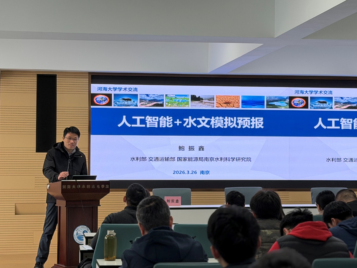 3月26日(周四)下午,av影片 在水电馆301会议室举办学术报告会,特邀国家“万人计划”科技创新领军人才、南京水利科学研究院水文水资源研究所总工程师鲍振鑫教授作题为“人工智能+水文模拟预报”的专题报告。报告会由方国华教授主持,学院相关方向教师和研究生共同参加。